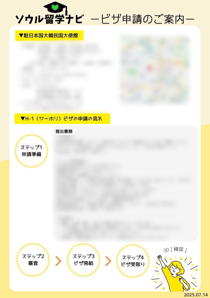 ソウル留学ナビでは、ビザ申請に必要な書類のご案内から、申請書の書き方・提出の流れまで丁寧にサポートしています🌸特にH-1ビザを申請される方には、活動計画書の添削や翻訳サポート*も対応! 顧問行政書士が在籍しているので、申請書類の改定があった場合も柔軟に対応が可能です🙆🏻♀️